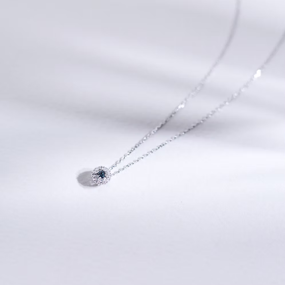 This platinum necklace features an alexandrite at its heart — a rare gemstone that shifts in colour with the light. Encircled by a halo of shimmering melee diamonds, the design captures a refined brilliance, perfect for everyday elegance or a subtle statement.
