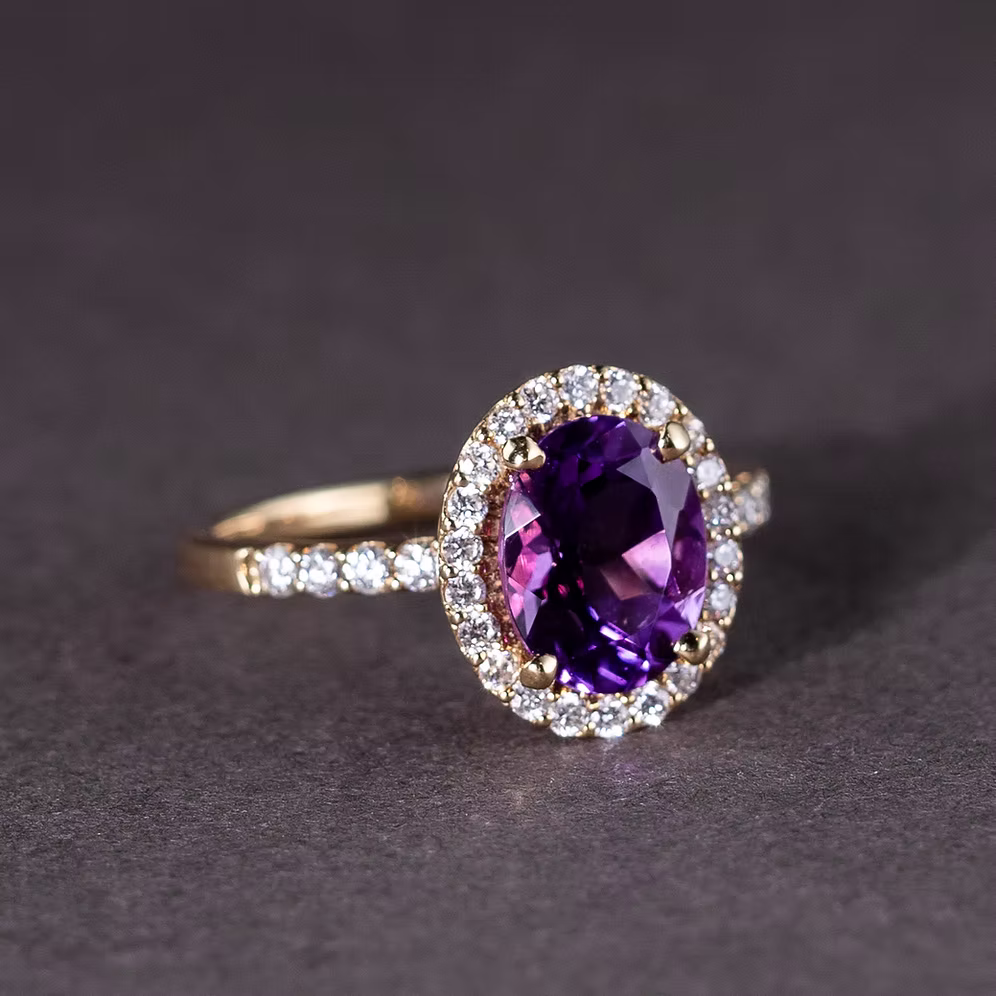 Exuding elegance in every detail, this breathtaking Amethyst gemstone ring is a true masterpiece. Its deep, enchanting hues evoke a sense of mystery and timeless allure. Encircled by a halo of pavé-set diamonds, the ring sparkles brilliantly, enhancing the mesmerizing beauty of the Amethyst.