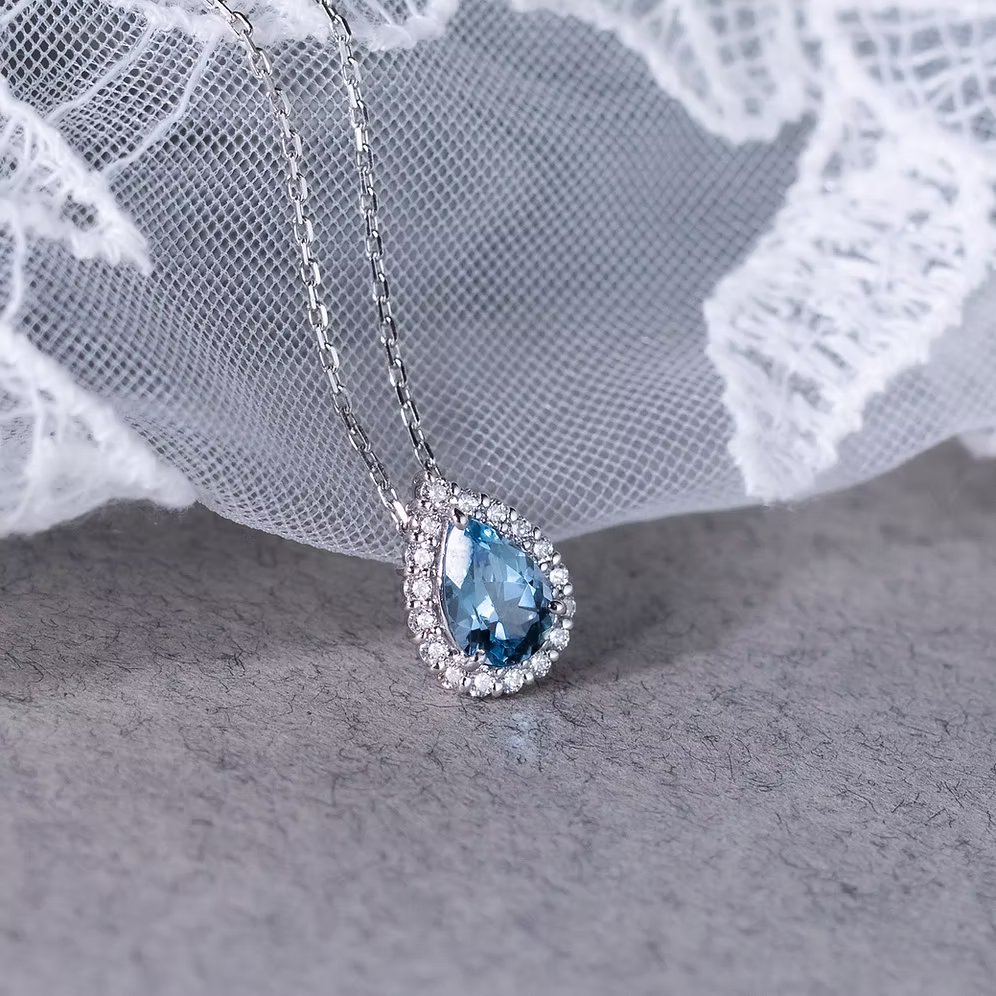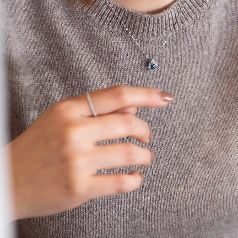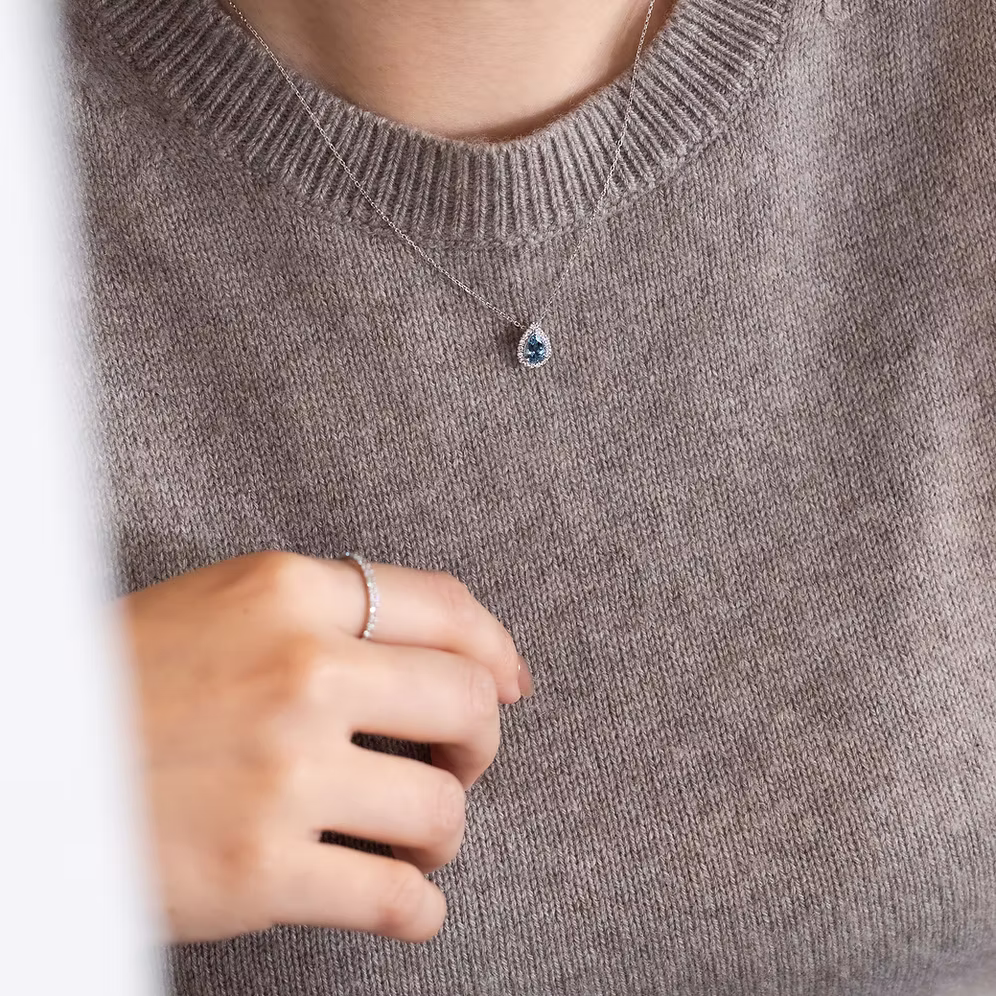 Dazzling in its elegance, the Petal Collection showcases pear-shaped stones surrounded by halo diamonds, enhancing the brilliance of the central gem. In particular, the Aquamarine Petal Necklace unveils the gentle blue shades of the beautiful gem.