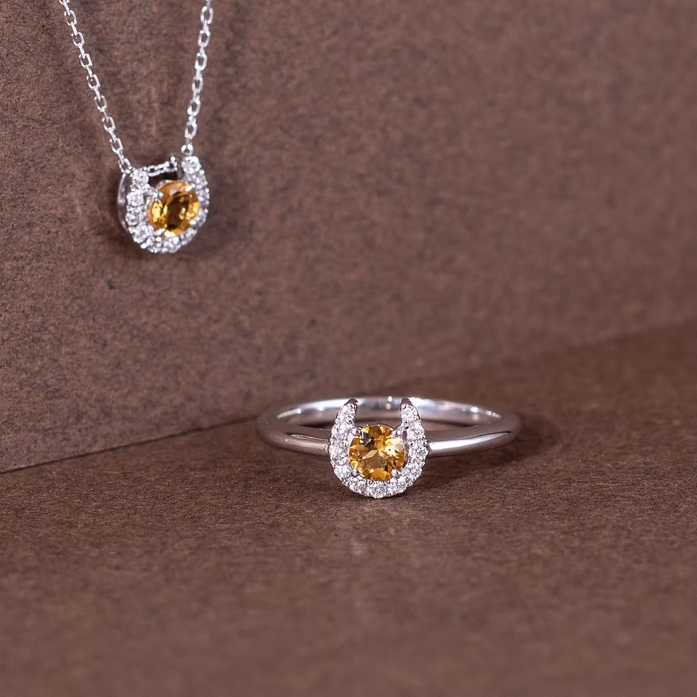 The Citrine Horseshoe Ring radiates warmth and positivity, featuring a vibrant citrine gemstone that captures the golden glow of sunlight. The horseshoe design, a symbol of luck and protection, cradles the citrine in a graceful arc, while a polished band adds a touch of sophistication. Perfect for those who cherish optimism and elegance, this ring brings a bright, cheerful charm to any occasion.