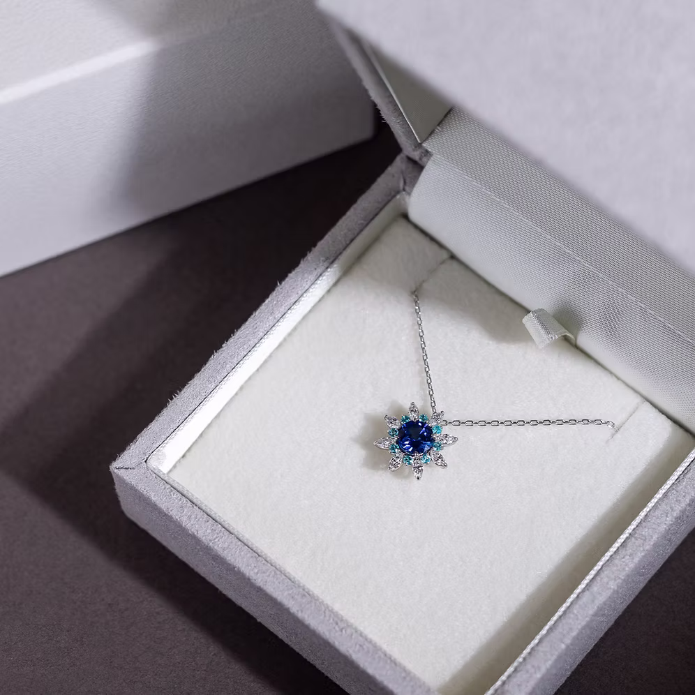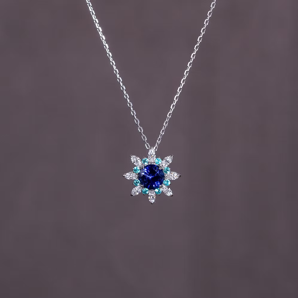 Inspired by the elegance of the cosmos flower, this necklace features a vibrant Blue Sapphire centre stone, framed by a delicate halo of Paraíba Tourmalines and marquise-cut diamonds forming petal-like shapes. Handcrafted in Japan, it blends striking colour with refined craftsmanship, creating a timeless floral motif to cherish for years to come.