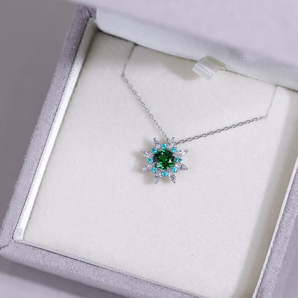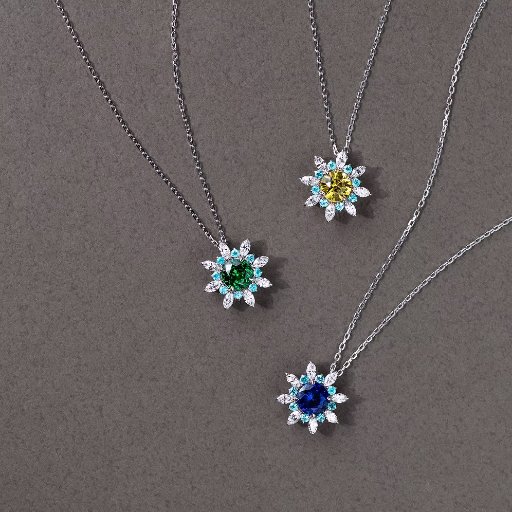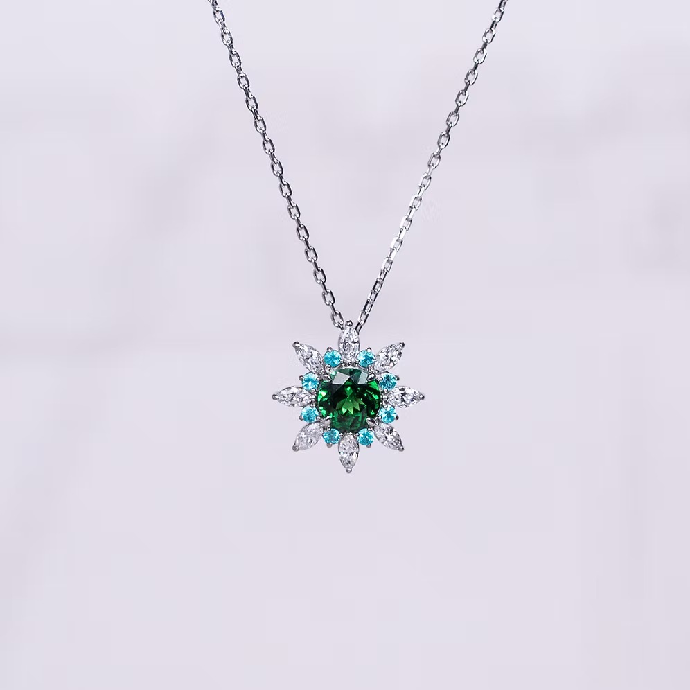 This Cosmos necklace showcases a rare and radiant Green Garnet centre stone, accented with vibrant Paraíba Tourmalines and marquise-cut diamonds that capture the delicate charm of the cosmos flower. A piece of wearable artistry, it’s handcrafted in Japan to celebrate nature’s grace in fine jewellery form.