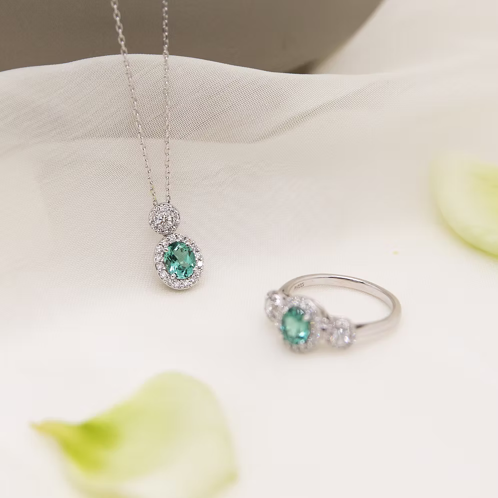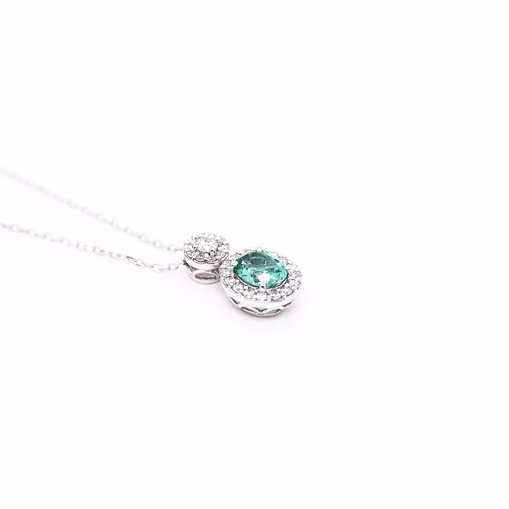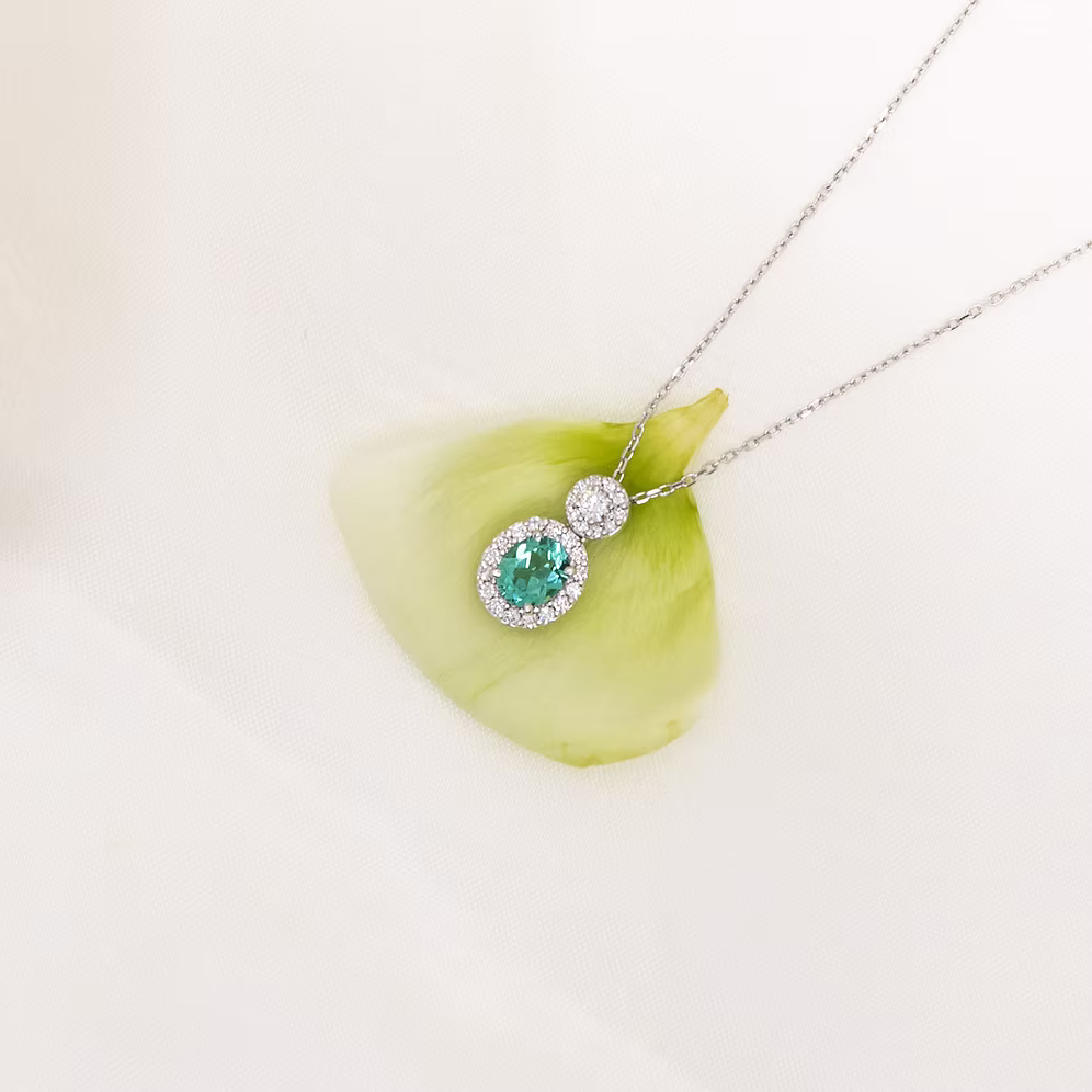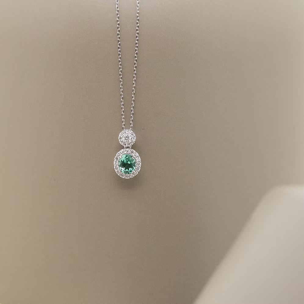 Introducing the exquisite Eira Collection, a celebration of timeless elegance and natural beauty. At its heart, a dazzling oval-cut mint tourmaline takes center stage, cradled in the enduring embrace of lustrous 900 platinum.