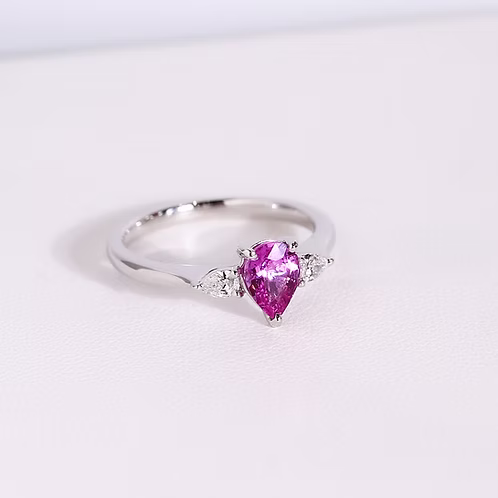 A pear-shaped pink sapphire is secured in prongs amid two sparkling pear-shaped diamonds. The beauty of the vivid pink gemstone is accentuated by precious diamonds, making this pink sapphire ring a visual delight.