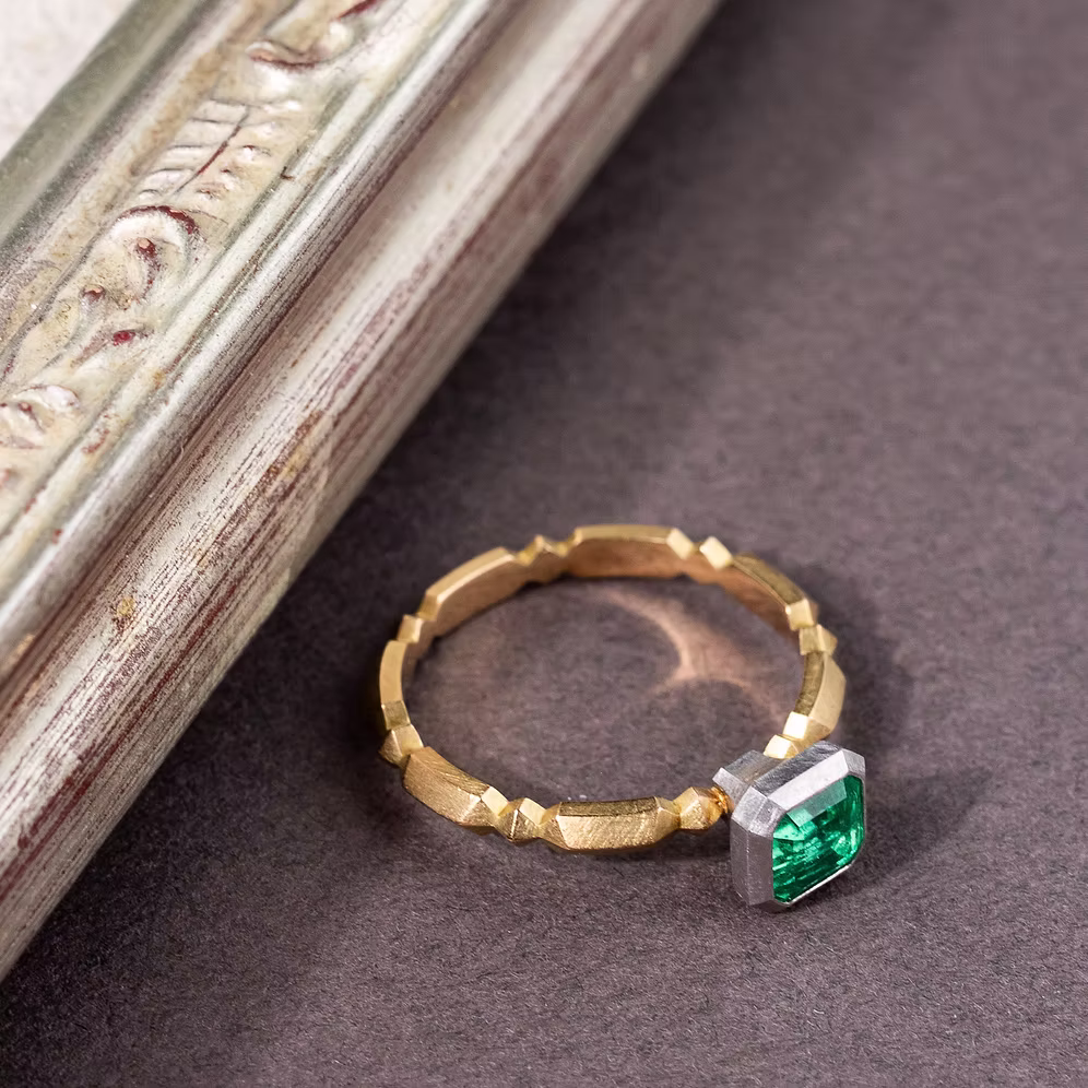 Emerald Smoke Ring by TomoeFrom the Smoke collection by Tomoe comes a bold interpretation of form and contrast. This distinctive design features a 0.81 ct Panjshir emerald—renowned for its intense green hue—bezel-set in platinum. The centre stone is framed by a sculptural band in hand-brushed yellow gold, crafted with geometric lines that echo the collection’s architectural spirit. A striking balance of structure and elegance.