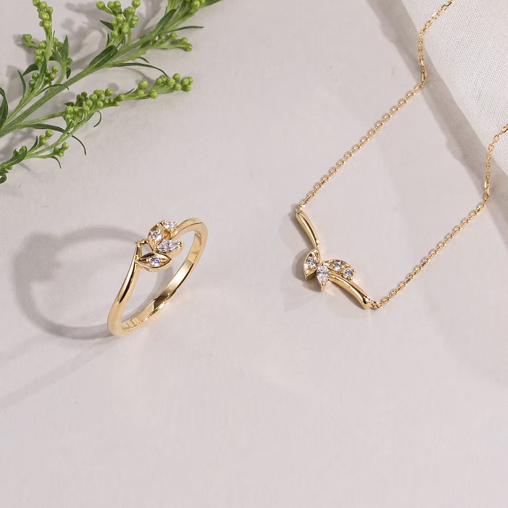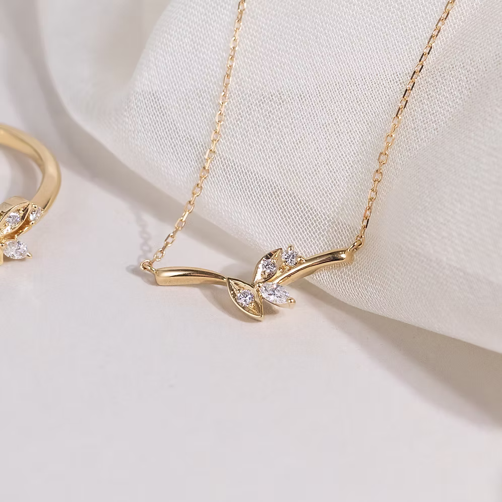 Drawing inspiration from the beauty of Spring’s new leaf sprouts, our designer has created a dazzling necklace in our Fleur series, featuring marquise and round-cut diamonds. This jewelry set adds a touch of sparkle to your daily style.