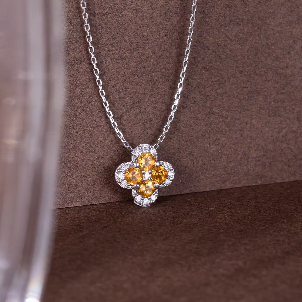 Introducing the Flower Birthday Citrine Necklace, where the radiant warmth of Citrine meets the timeless beauty of nature. This exquisite design features four brilliant citrine gemstones, elegantly arranged in a delicate flower motif. Each citrine sparkles with a golden glow, set against polished white gold and accented by the brilliance of fine diamonds, creating a piece that’s both vibrant and enchanting.