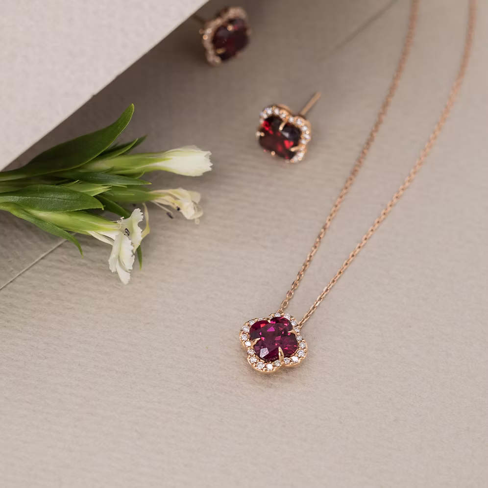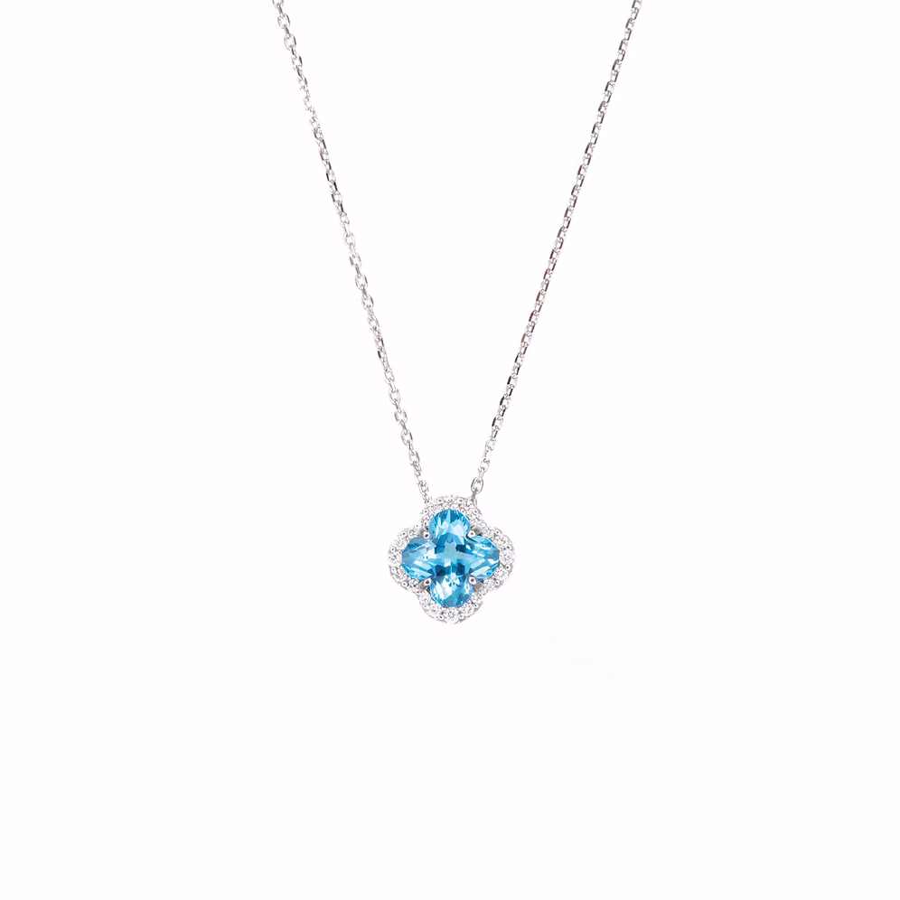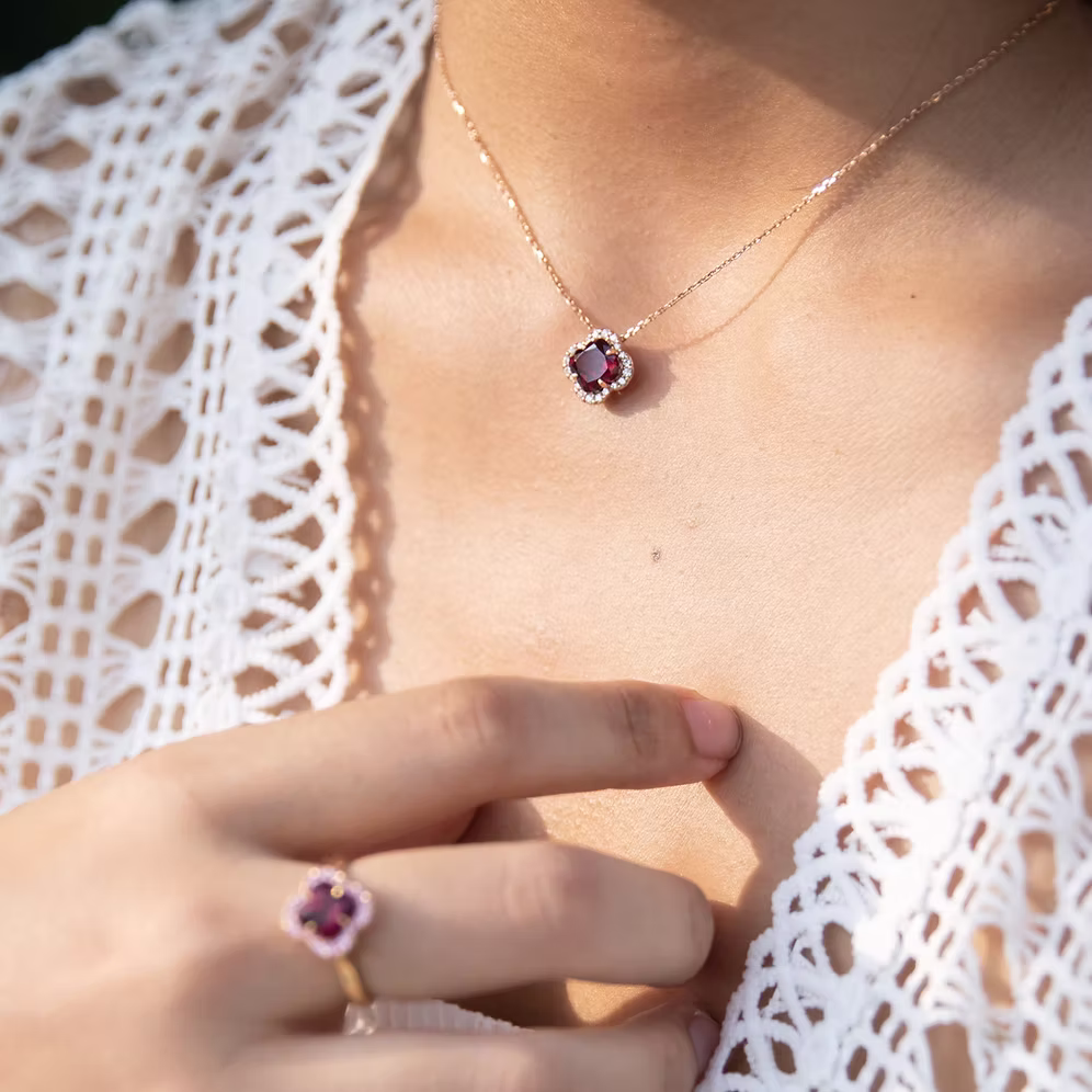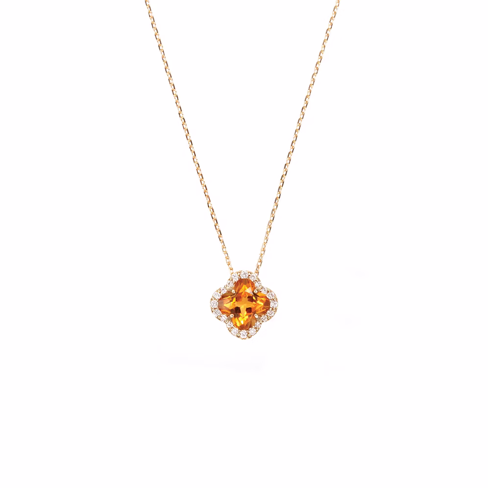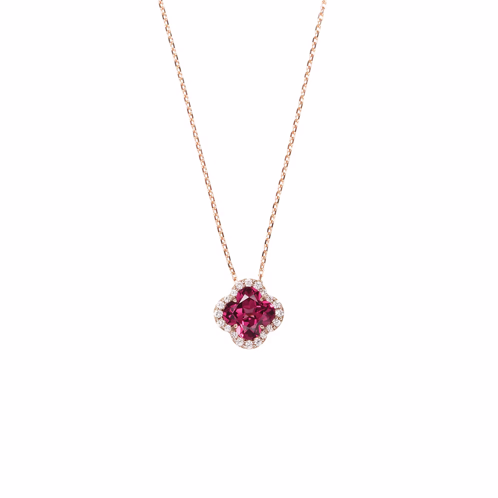 Our artisans meticulously carve Rhodolite Garnet, Blue Topaz, Citrine, Amethyst and Peridot into enchanting flower-shaped gems, accentuated by a dazzling halo of diamonds, enhancing the stone’s natural radiance.