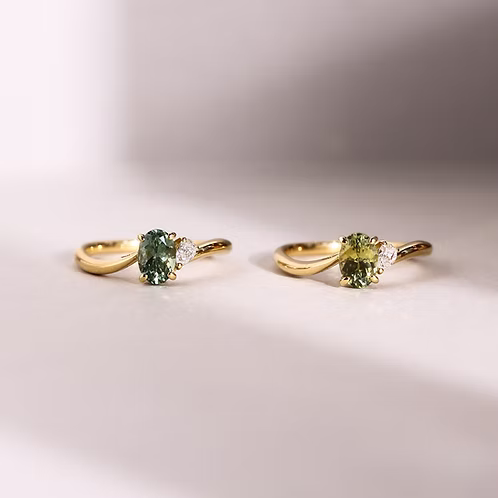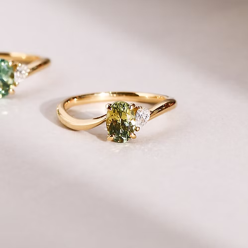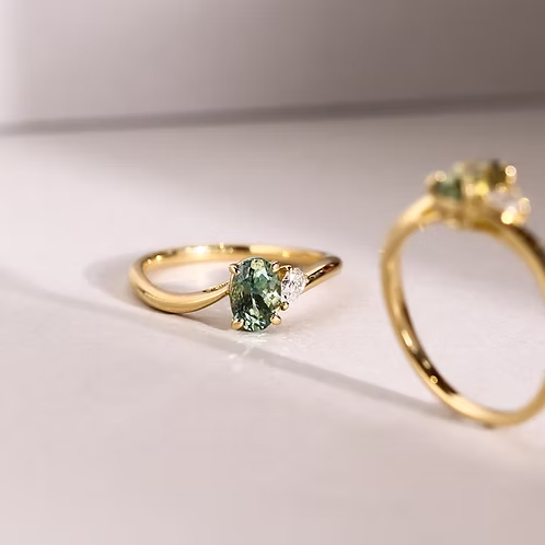 Featuring a mixed-tone Montana Sapphire, set on a gracefully curved band. Like the first dew drop in the Spring morning, the sapphire is paired with a pear-shaped diamond to create a refreshing look.