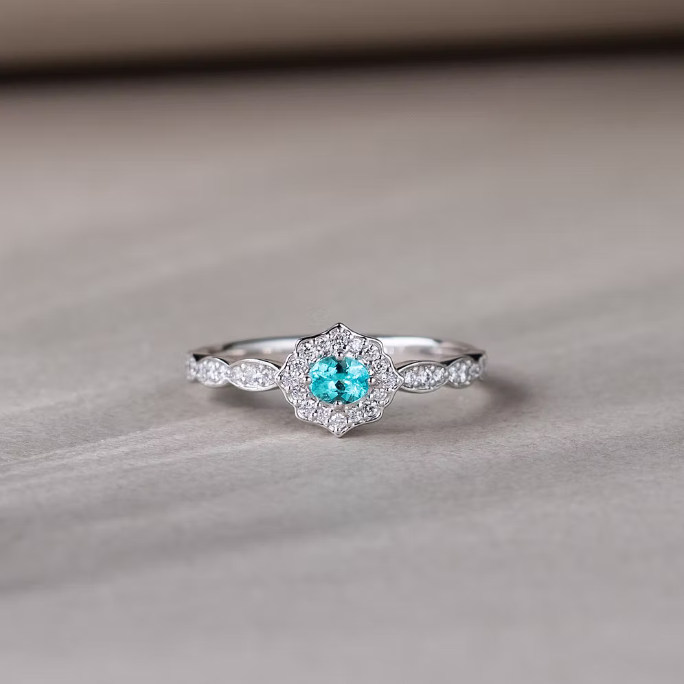 The Helena Collection is inspired by vintage European mirrors, with elegant frames echoing timeless refinement. At the centre, a vivid oval-cut Paraiba Tourmaline glows with oceanic brilliance, surrounded by scintillating melee diamonds that enhance its radiance. Available in both ring and necklace designs, Helena captures regal elegance in every detail.