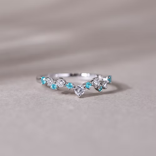 The vivid blue-green glow of Paraiba adds a gentle pop of colour, while diamonds bring a refined brilliance to the design.
