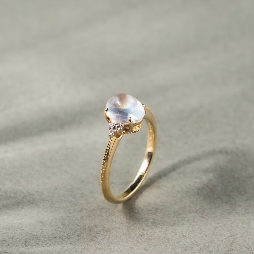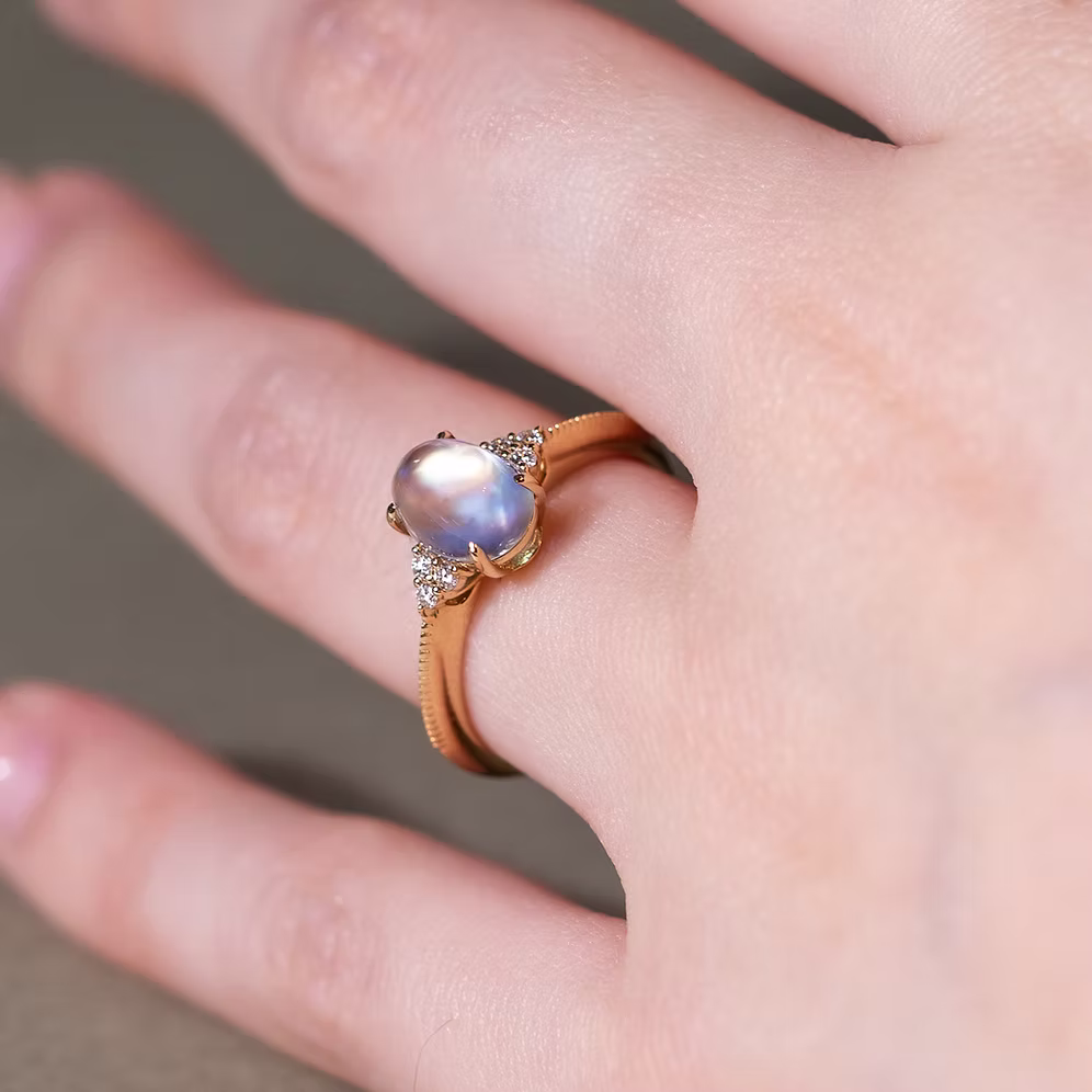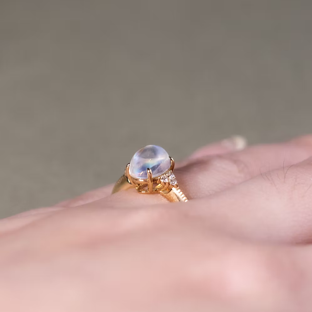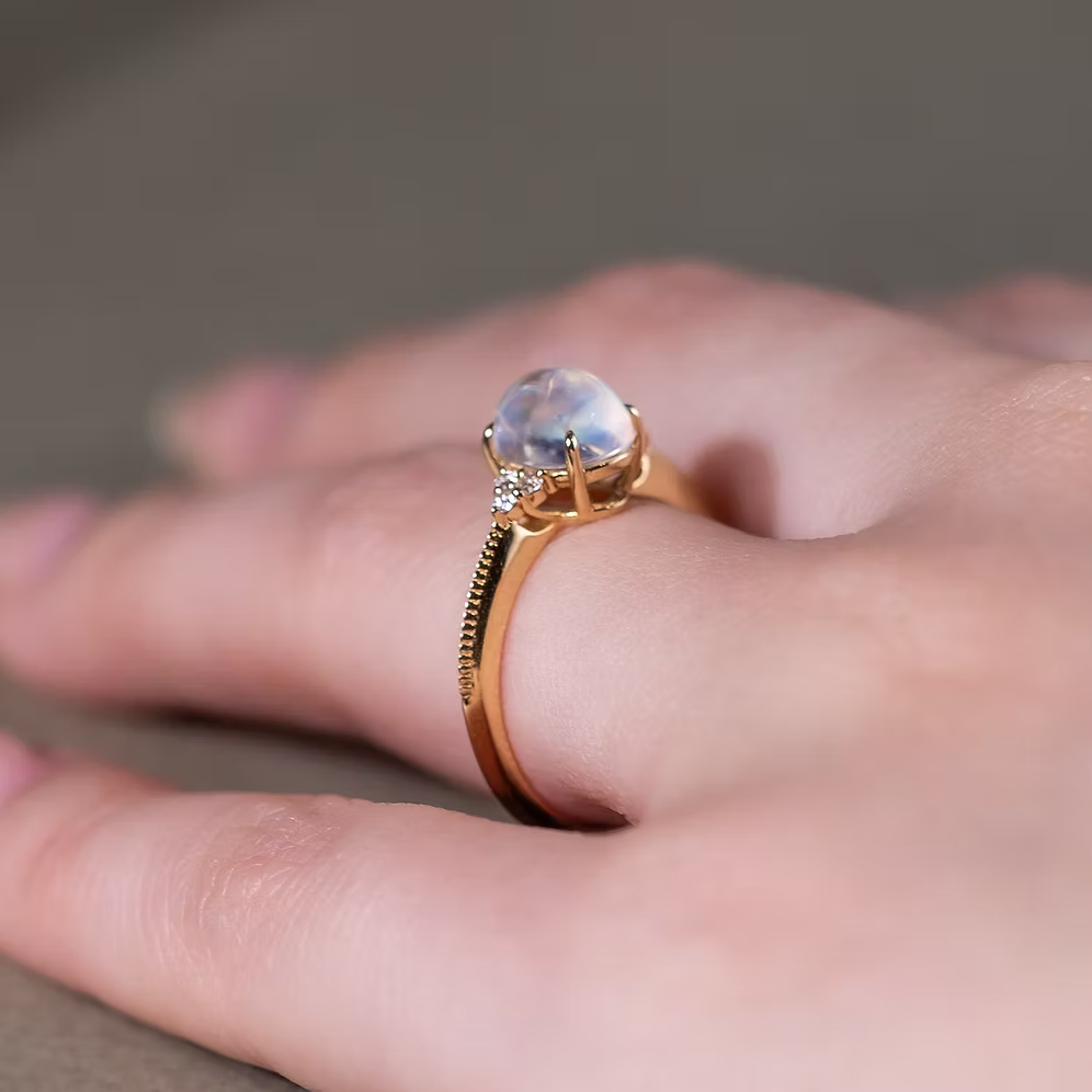 Introducing the Moonstone Edith Ring, showcasing a mesmerizing moonstone center stone. Enhanced by the intricate milgrain details of the Edith setting, delicately adorning the band, this ring radiates European-inspired elegance with a timeless allure. Ideal for admirers of refined sophistication, it offers a graceful touch that remains eternally chic.