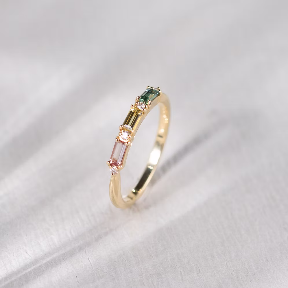 A soft harmony of colour and light, the Palette Ring features pastel-hued sapphires in elegant baguette cuts, arranged side by side in a delicate band. Inspired by an artist’s colour palette, each ring is a quiet celebration of subtle beauty—an effortless way to wear colour in your everyday. The sleek, linear form of the baguette-cut stones brings a modern edge, while the gentle tones—from blush pink to icy blue—add a whisper of charm and personality to your stack or worn solo.