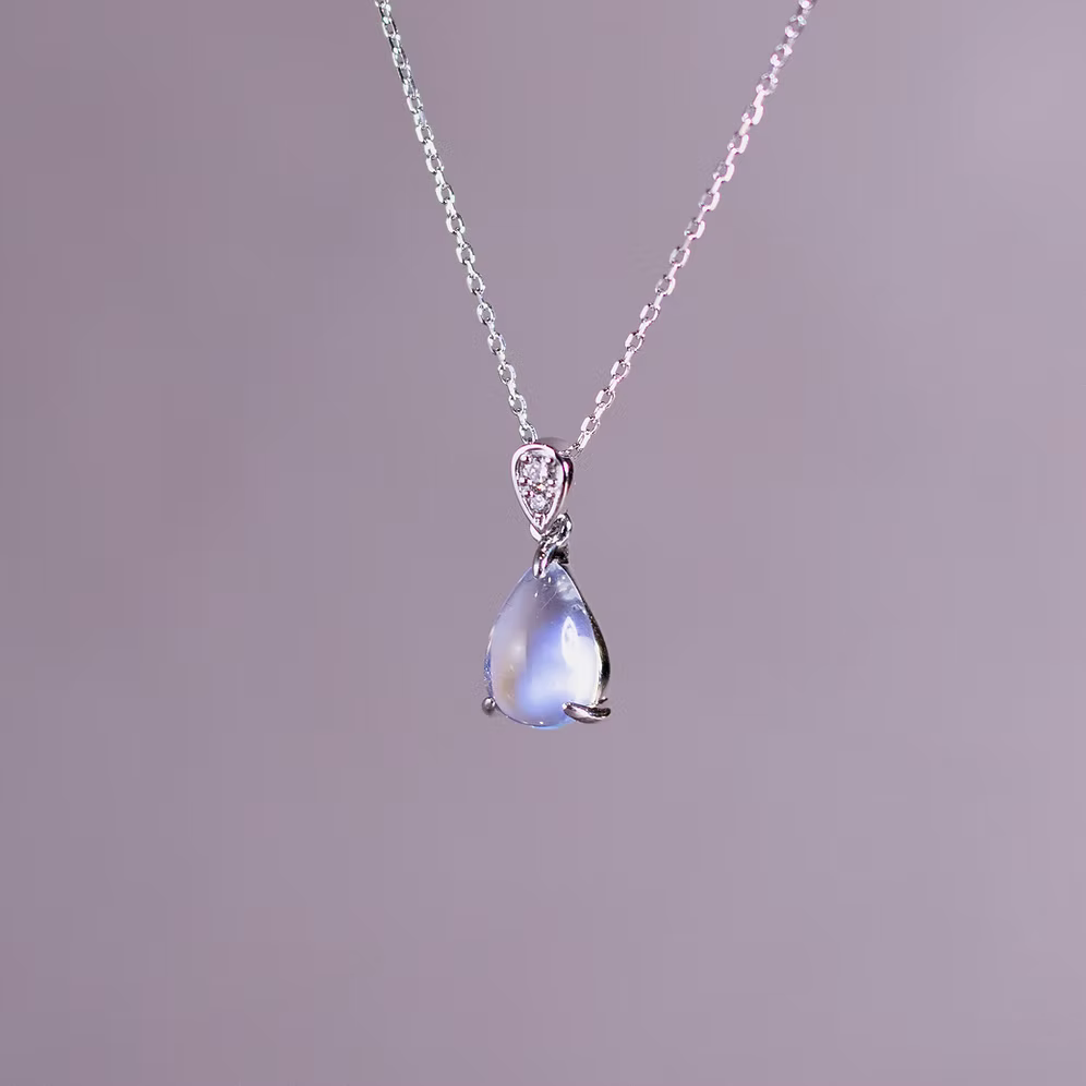 Crafted in platinum, this necklace features a pear-shaped translucent moonstone that glows with a soft blue sheen. Embraced by sparkling diamonds that enhance its natural brilliance, the design exudes timeless elegance inspired by the serenity of moonlight.