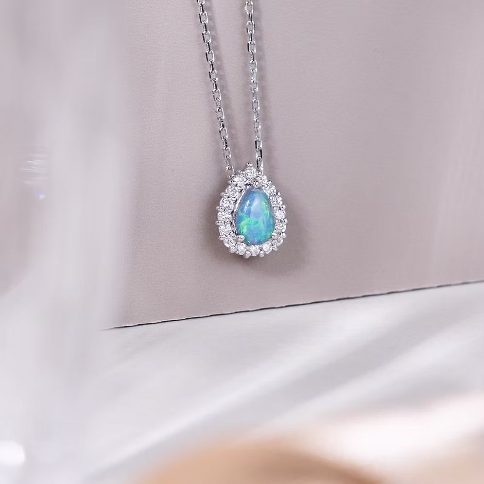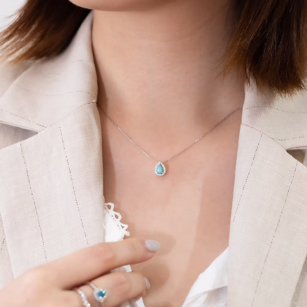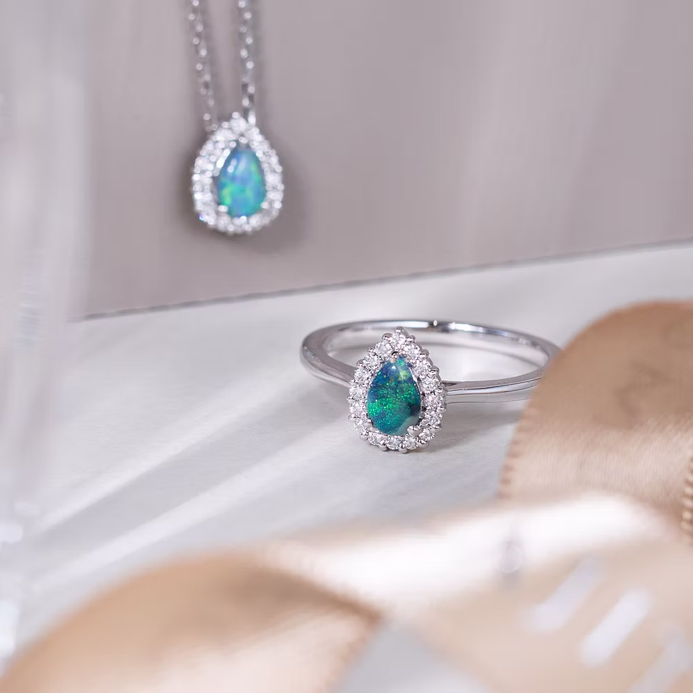 Dazzling in its elegance, the Petal Collection showcases pear-shaped stones surrounded by halo diamonds, enhancing the brilliance of the central gem. In particular, the Black Opal Petal Necklace unveils the captivating play-of-colour inherent to opals, a stunning representation of nature’s beauty.  The mesmerizing black opal’s deep, mysterious base is illuminated by an array of vibrant colors—fiery reds, electric blues, and rich greens—each hue dancing with every movement.
