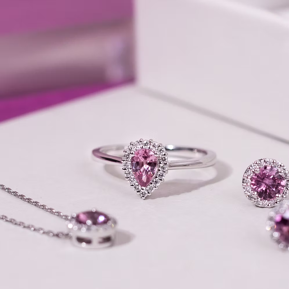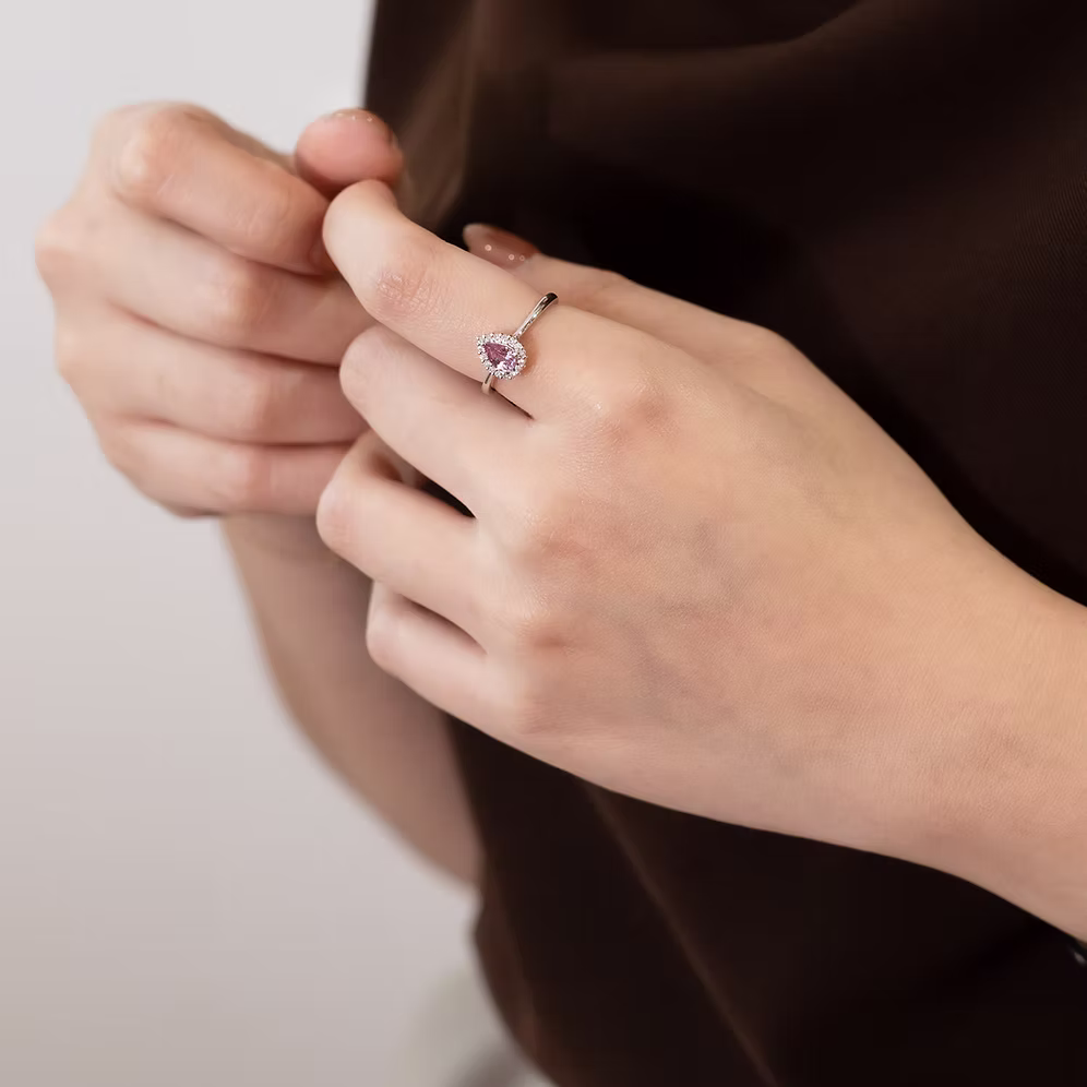 This exceptional piece from our Petal Collection stands out with its rare, pinkish Padparadscha Sapphire, reminiscent of delicate Sakura blossoms in full bloom. The pear-shaped gemstone, surrounded by a halo of shimmering diamonds, exudes a soft and ethereal beauty, distinct from the rest of the collection. As a one-of-a-kind creation, this ring captures the fleeting elegance of nature, making it a truly unique treasure.