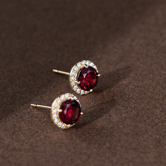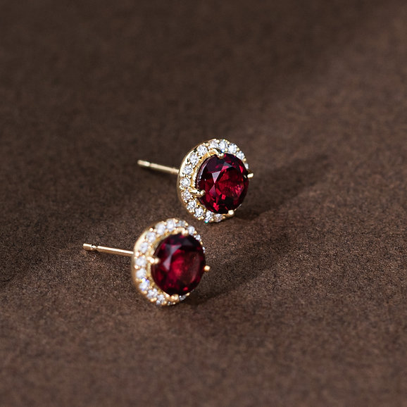Celebrate a classic look with these rich, deep hues purplish-red Rhodolite Garnet studs complemented by a radiant halo of sparkling diamonds.