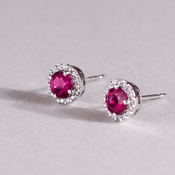 Celebrate a classic look with these pinkish Ruby studs surrounded by a halo of glistening diamonds.