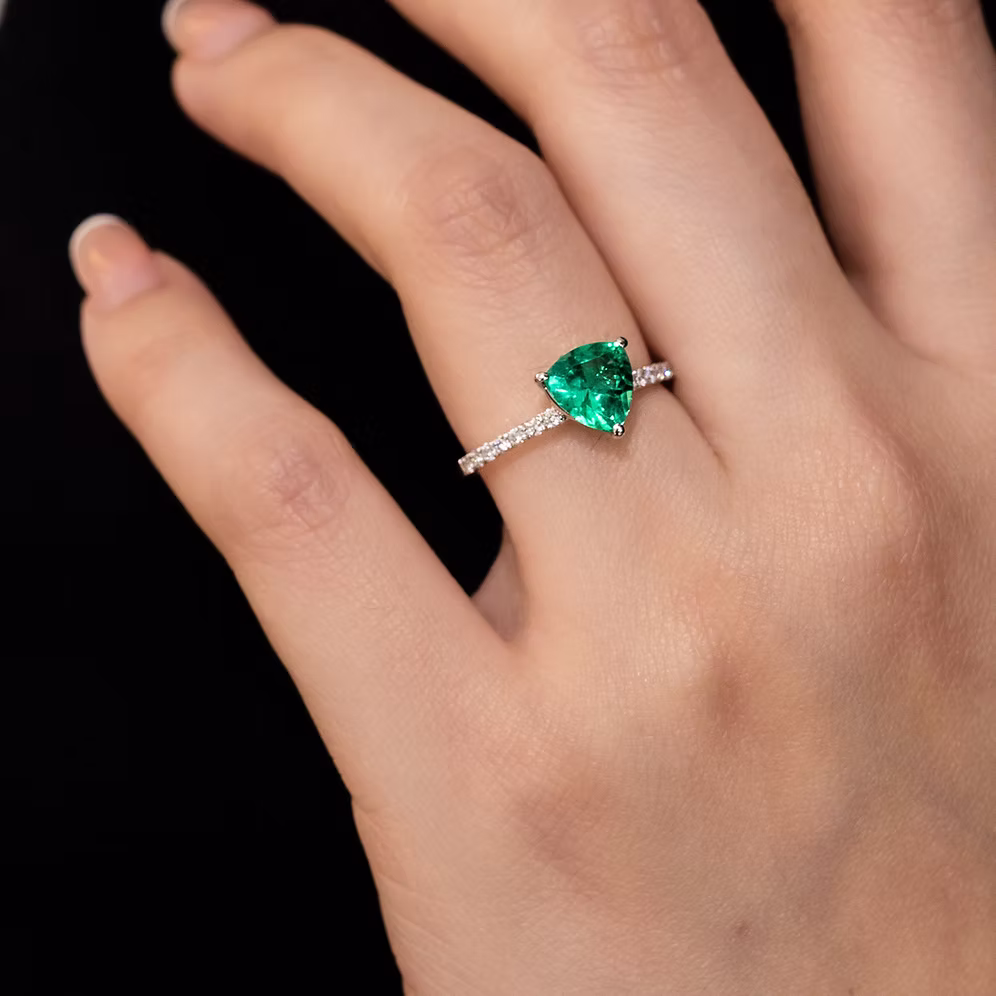 This exceptional 1.00 ct Trilliant-cut emerald, GIA certified and sourced from Russia, showcases a vivid green hue and remarkable clarity—hallmarks of Russian emeralds, prized for their bright colour and fewer inclusions. Set in a timeless diamond band, this one-of-a-kind ring combines striking brilliance with classic elegance. A rare treasure for collectors and connoisseurs alike.