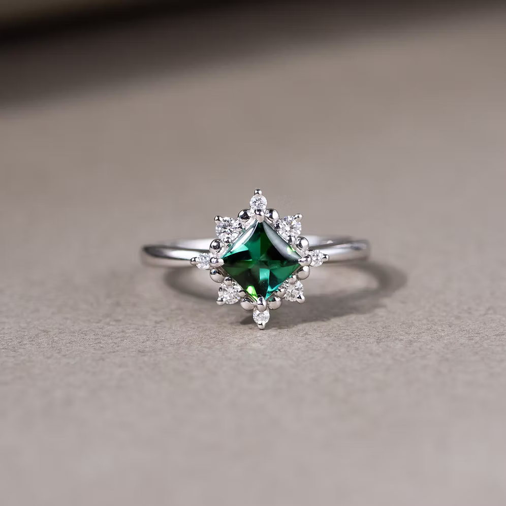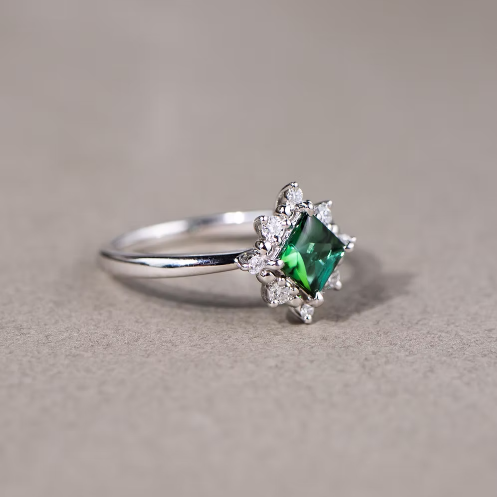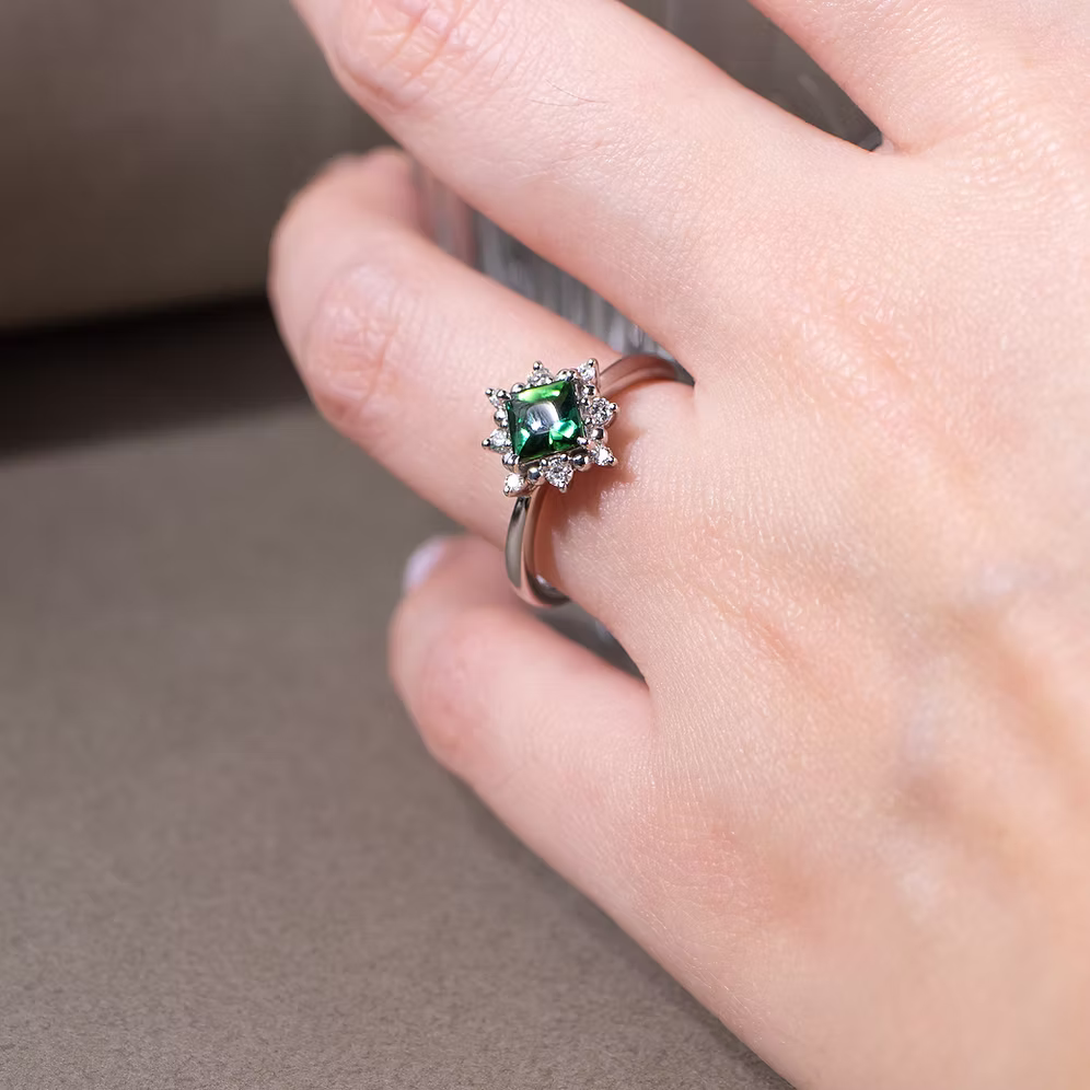 The Stella Ring features a cabochon princess-cut Tourmaline, where its lush forest green hue is softened by gentle contours, revealing a warm, luminous glow.