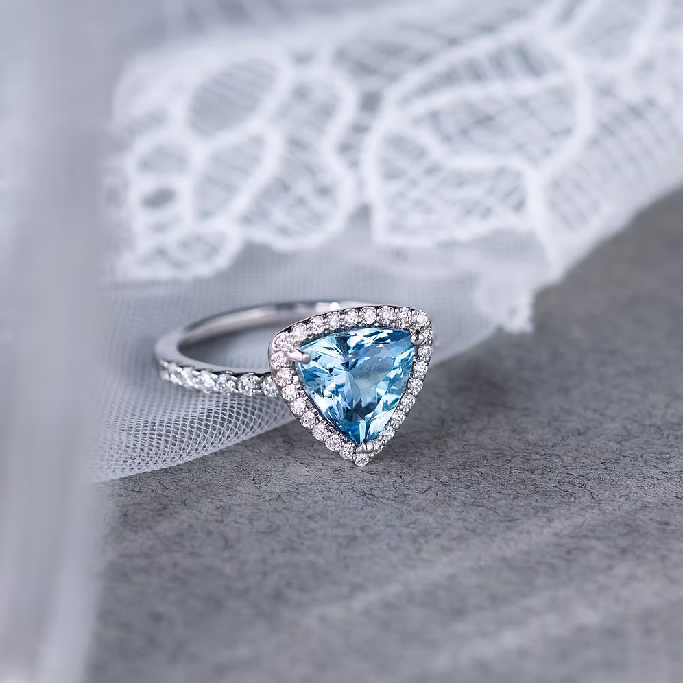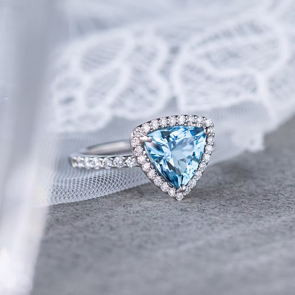 This exquisite trilliant cut aquamarine halo ring features a 2.19-carat aquamarine stone, renowned for its captivating blue hue. The stunning stone is set in a beautifully crafted halo design, enhancing the aquamarine’s brilliance and showcasing its perfect cut.